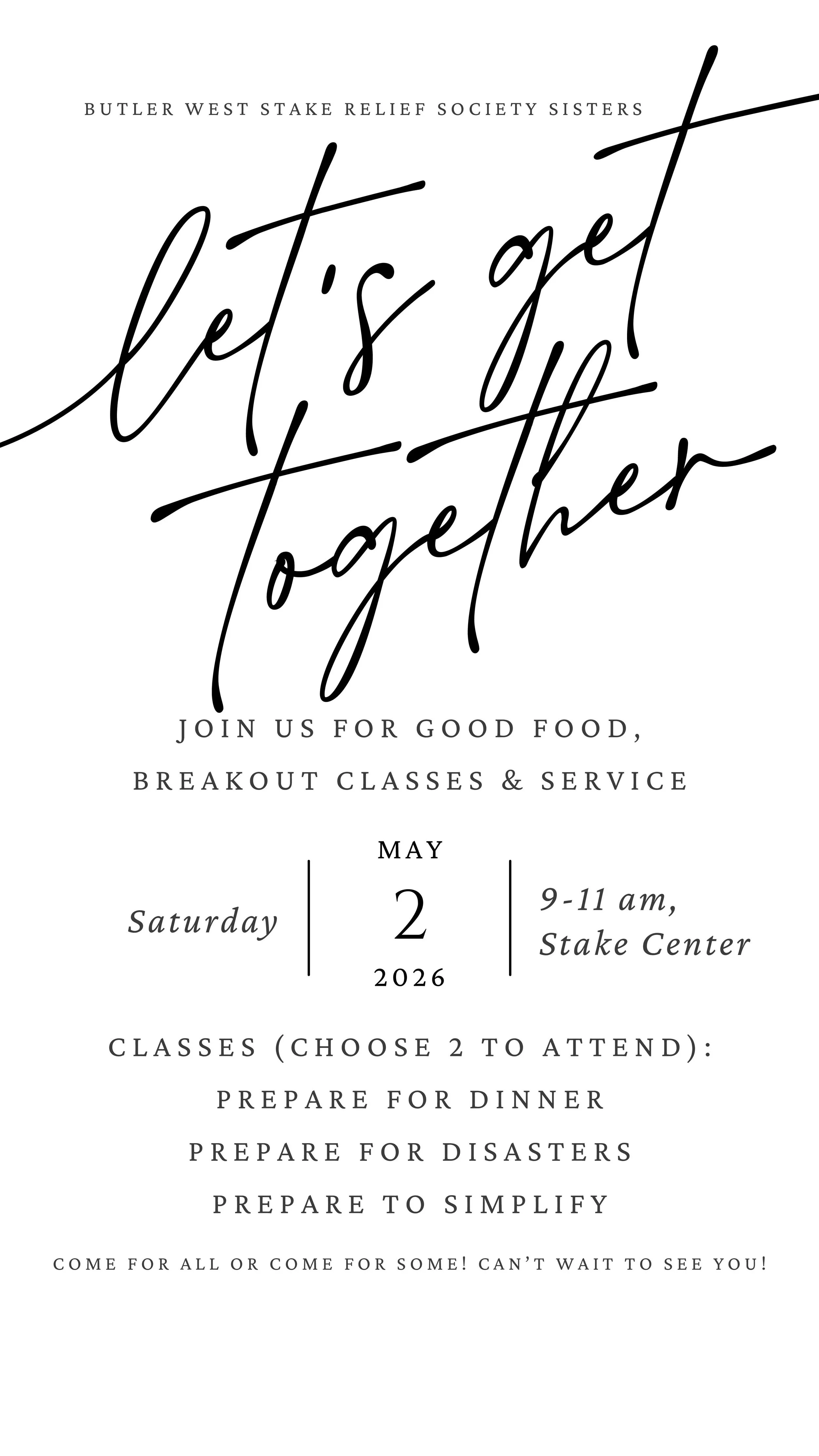 9am at the Stake Center. We will have good food, a service opportunity, and fun breakout classes!